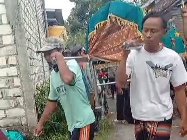 Rumah duka kedua orang tua bocah yang masih duduk dibangku MI ini berdekatan hanya berjarak dua rumah tetangga. Tepat pukul 16.30 WIB. dua keranda jenazah berjalan beriringan menuju pemakaman setelah disalati oleh masyarakat Kabalan.