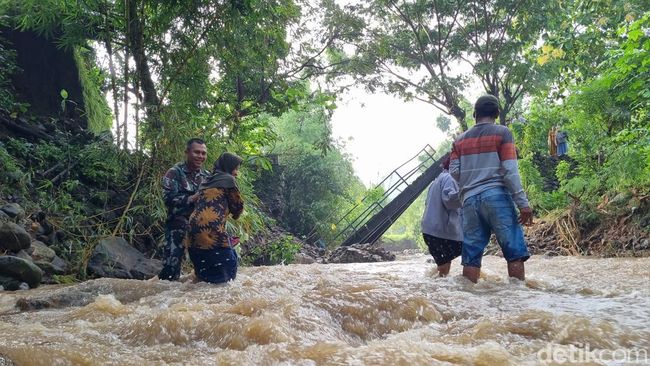 "Karena jembatan roboh total, saya ikut berjalan kaki menyeberang sungai mengantar anak. Kan anaknya mau sekolah di SMPN 2 Bungkal," katanya.