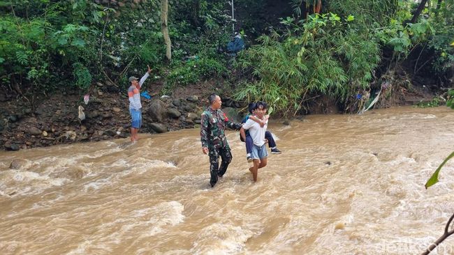 Babinsa Desa Munggu, Serda Cahyo Arif, bahkan turut membantu delapan orang menyeberang sungai karena khawatir dengan derasnya arus.