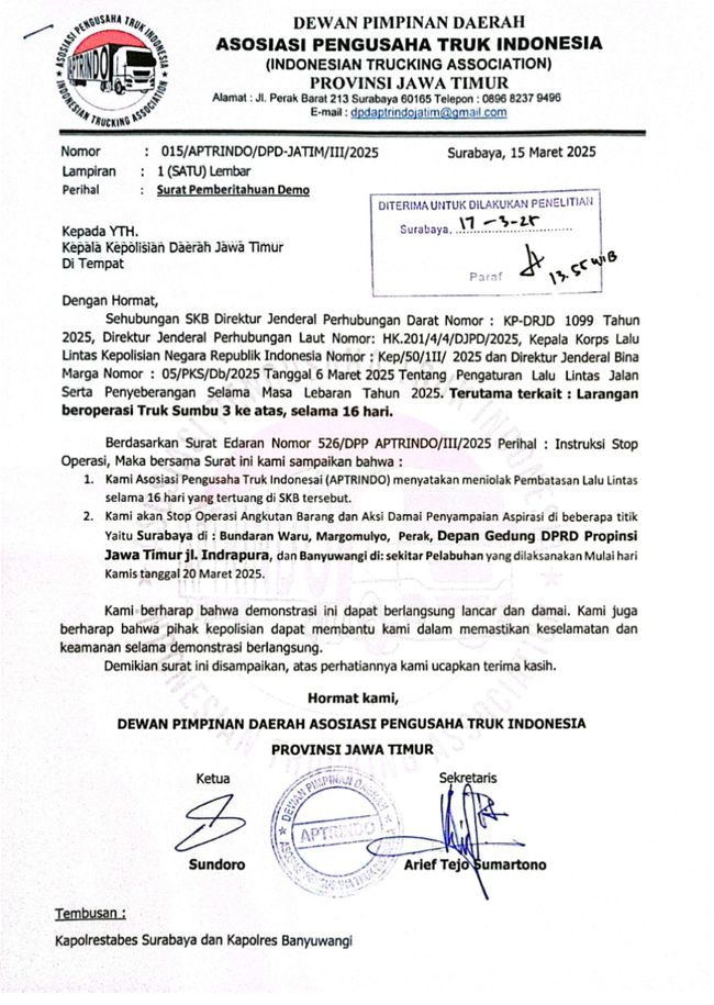 Dewan Pimpinan Daerah (DPP) Aptrindo Jatim menyatakan aksi ini akan diikuti 50 perusahaan angkutan barang di Jawa Timur. Tuntutan utamanya merevisi durasi pembatasan operasional angkutan barang selama masa mudik dan balik Lebaran tahun 2025.