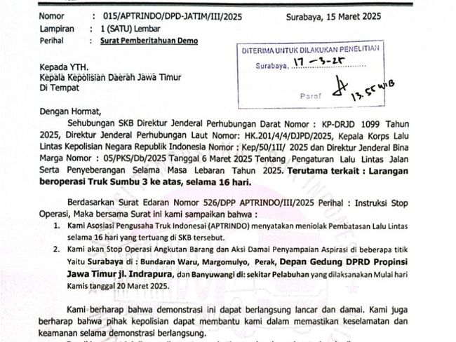Hal ini menuai reaksi dari Asosiasi Pengusaha Truk Indonesia (APTRINDO). Ketua Umum DPP Aptrindo, Gemilang Tarigan menyampaikan akan menggelar aksi protes dengan menyetop seluruh operasional pada Kamis (20/3/2025) dan Jumat (21/3/2025). Aksi ini dilakukan sebagai bentuk protes pembatasan angkutan barang selama 16 hari pada periode Lebaran 2025.