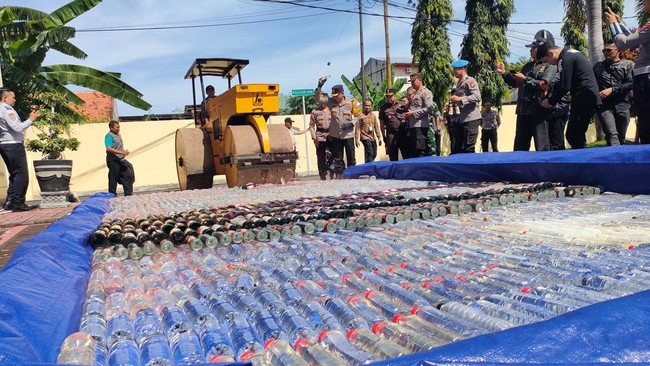 Barang bukti yang dimusnahkan di antaranya, 1.664 botol miras jenis arak, 229 botol miras jenis anggur yang dimusnahkan menggunakan alat berat.