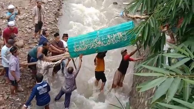 Warga terpaksa memindahkan keranda jenazah dengan melewati sungai karena jembatan yang merupakan akses satu-satunya roboh. Pemindahan keranda jenazah itu terjadi pada Rabu (20/3) sekitar pukul 16.00 WIB.