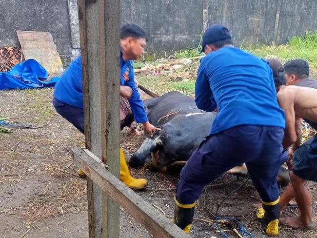 Setelah menerima laporan, petugas Damkar yang berjumlah 7 orang kemudian meluncur ke lokasi dan memulai mengevakuasi sapi yang terperosok lumpur. Petugas memasang tali di badan sapi untuk kemudian menariknya dari kubangan.