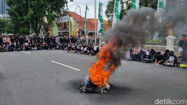 Massa aksi terus meneriakkan kekesalannya dengan menolak UU TNI di depan Gedung Negara Grahadi. Mereka berteriak bahwa rakyat kecewa dengan Presiden Prabowo Subianto.