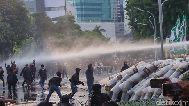 Puluhan aparat yang telah disiagakan pun keluar dan membuat barikade. Mereka tampak menahan berbagai serangan lemparan dari massa demonstran.Sedangkan mobil water cannon terus menyemprotkan air dari belakang. Di Tengah-tengah itu terdengar suara tembakan.