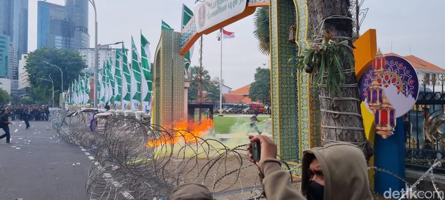 Lemparan sejumlah flare dan molotov juga mengenai kawat berduri.