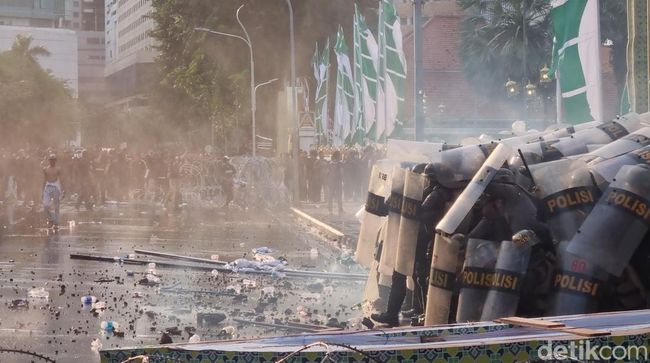 Water canon pun mulai menyemprot kerumunan massa. Kuatnya semprotan membuat massa mundur. Polisi kemudian membentuk barikade dan pagar betis. Pagar betis polisi tersebut terus maju meski terus dilempari batu.