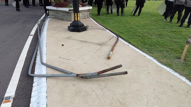 Tidak hanya fasilitas di Grahadi yang rusak, dua aparat yang bertugas di lokasi juga terkena lemparan benda oleh demonstran.