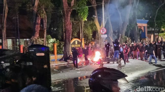 Kericuhan demo tolak UU TNI di Gedung Negara Grahadi Surabaya masih berlanjut hingga malam ini. Demonstran yang masih bertahan membakar water barrier di depan SMAN 6 Surabaya.