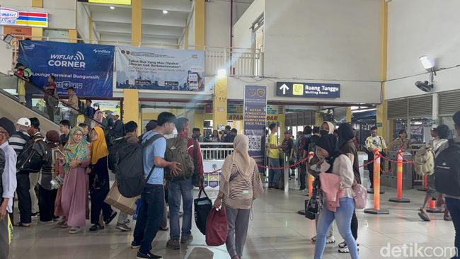 Hari pertama lebaran 2025, Terminal Purabaya dipadati 24.219 penumpang. Mereka memadati area kedatangan maupun keberangkatan.