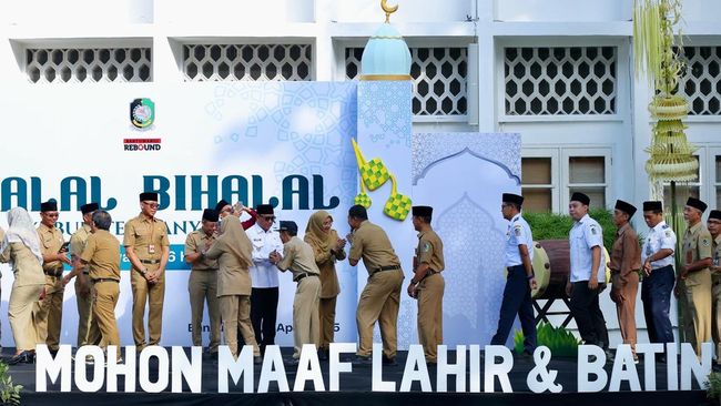 Usai apel pembukaan hari pertama kerja, Ipuk juga menggelar halal bihalal dengan berjabat tangan bersama seluruh ASN yang hadir. Ia memastikan tidak ada ASN yang bolos dan semua siap kembali bertugas dengan semangat penuh pasca libur.