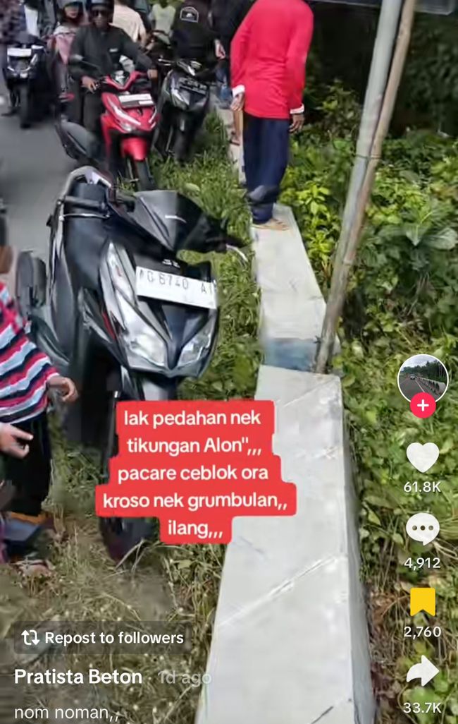 "Lek pedahan nek tingkungan Alon2, pacare ceblok ora kroso nek grumbulan. Ilang. (Kalau naik motor di tikungan pelan-pelan, tidak terasa pacarnya jatuh di semak. Hilang)," tulis caption dalam video yang dilihat detikJatim.