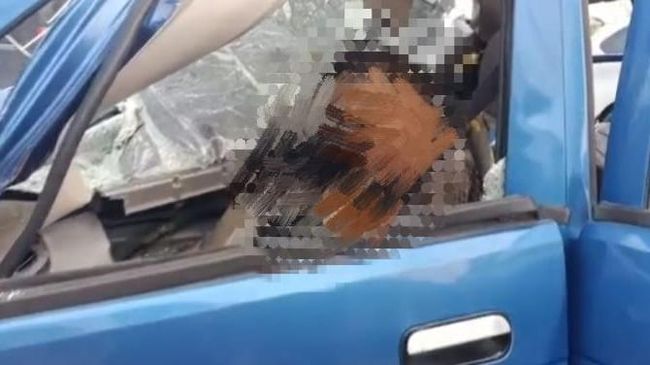 Penumpang mobil di bagian belakang dan tengah dalam kondisi tengkurap tak bernyawa. Kecuali penumpang yang duduk di bagian depan, tampak seorang bapak memangku anaknya menghadap depan mobil.