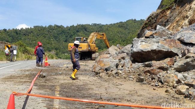 Saat ini, tim Balai Besar Pelaksanaan Jalan Nasional (BBPJN) Kementerian Pekerjaan Umum menerjunkan satu unit ekskavator untuk melakukan proses pembersihan material longsor.