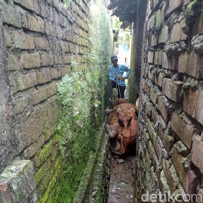 Dari keterangan warga, kata Siswanto, sapi tersebut awalnya dinaikkan ke atas truk. Namun hewan tersebut tiba-tiba memberontak dan lari, hingga akhirnya terjebak di sela-sela jalan sempit antara 2 bangunan rumah.