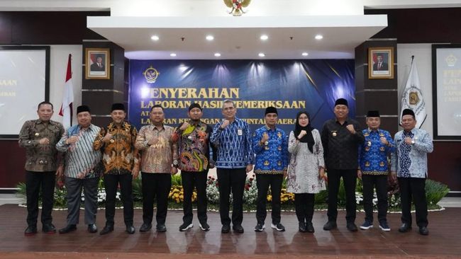 Badan Pemeriksa Keuangan (BPK) Perwakilan Jatim resmi menyerahkan Laporan Hasil Pemeriksaan (LHP) atas Laporan Keuangan Pemerintah Daerah (LKPD) Tahun 2024 kepada 10 kabupaten di Jatim, Kamis (17/4/2025). Semua daerah berhasil meraih opini Wajar Tanpa Pengecualian (WTP).