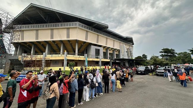 Pantauan di lokasi, ratusan penonton dan suporter mulai memadati halaman GOR Jayabaya. Mereka mengaku datang untuk menukar tiket online. Akibatnya, antrean penukaran tiket nampak mengular.