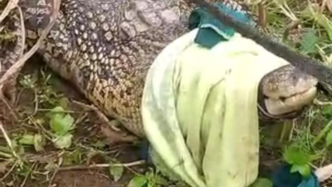 Dalam video berdurasi 2 menit 52 detik yang beredar di Instagram itu terlihat buaya besar tersebut diam dengan mata tertutup kaus, sedangkan mulutnya sudah terikat. Salah satu warga yang berada di lokasi menyebutkan panjang buaya itu mencapai 3 meter.