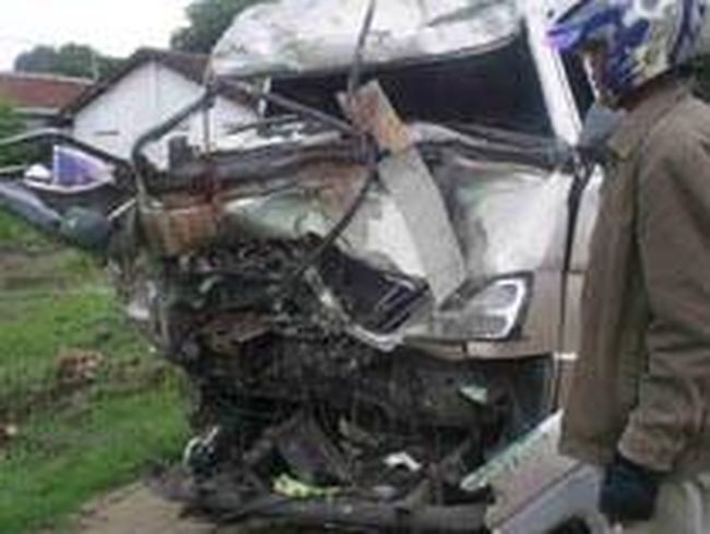 Truk tronton muat biskuit yang dikemudikan Ponco Prasetyo (25) oleng. Truk itu lalu menghantam minibus travel Bali Prima yang sarat penumpang.