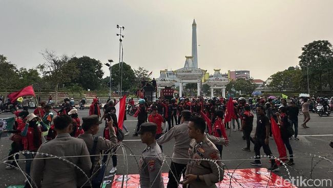 Pantauan detikJatim, massa buruh mulai berdatangan sejak pukul 13.30 WIB. Mereka berasal dari sejumlah organisasi serikat buruh, mulai FSPMI, FSRP, SBSI, hingga FSP Farkes.