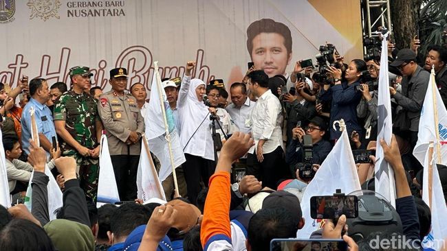 Gubernur Jatim Khofifah Indar Parawansa menerima dan menandatangani 17 tuntutan para buruh yang menggelar aksi di Kantor Gubernur Jatim. Buruh pun meneriakkan Khofifah gubernurnya para buruh.