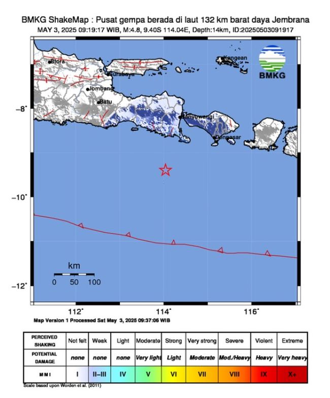 "Pusat gempa berada di laut, 132 km barat daya Jembrana, Bali, dengan kedalaman 14 km," tulis BMKG dalam keterangannya yang dilihat detikJatim, Sabtu (3/5/2025).