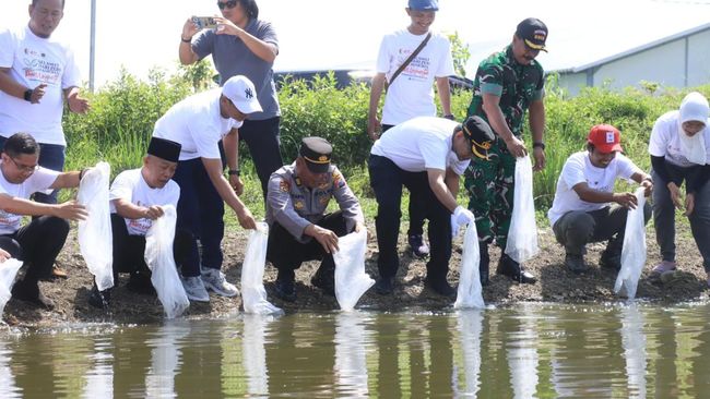 Polres Bojonegoro bersama TNI menanam pohon dan menebar benih ikan di embung Desa Ngumpakdalem, Kecamatan Dander, Bojonegoro. Kegiatan ini diinisiasi wartawan setempat.