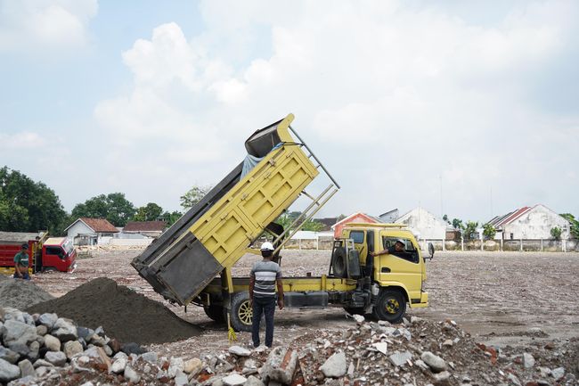 Pantauan di lapangan pada Kamis (15/5) lokasi pekerjaan telah diratakan. Truk pengangkut material pun keluar masuk lokasi proyek. Pekerja juga terlihat mulai mengerjakan pembuatan pondasi untuk pagar sisi depan.