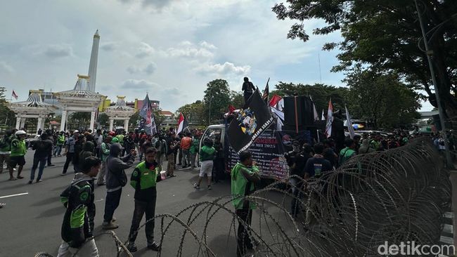 Massa aksi demo driver ojek dan taksi online (ojol) sudah masuk ke Kantor Gubernur Jatim, Selasa (20/5/2025). Jalan Pahlawan, Surabaya ditutup sementara.