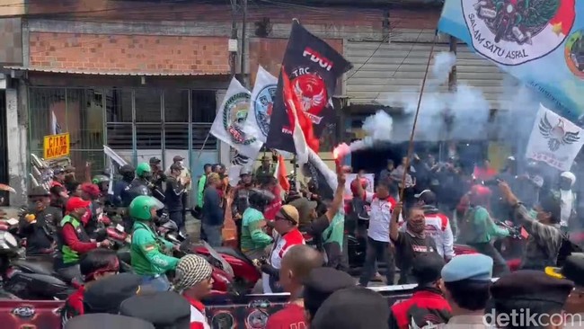 Ketegangan sempat terjadi ketika sejumlah driver berusaha membakar ban bekas sebagai simbol perlawanan. Seorang pria yang diduga aparat mengambil ban itu hingga memicu adu mulut dan aksi saling dorong antara massa dan petugas.