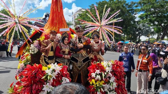 Dari pantauan detikJatim, sejak siang Jalan Pahlawan sudah dipadati warga yang antusias menonton jalannya parade. Wali Kota Surabaya Eri Cahyadi bersama istrinya Rini Indriyani tiba di lokasi sekitar pukul 13.24 WIB mengenakan pakaian adat daerah.