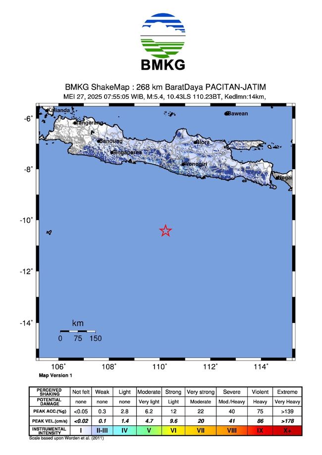 Getaran gempa bumi yang berpusat di Pacitan, dirasakan warga di sejumlah wilayah di Jawa Timur hingga Daerah Istimewa Yogyakarta, Selasa (27/5/2025) pagi. Gempa yang dimutakhirkan jadi magnitudo M 5,4 (sebelumnya M 5,7) itu terjadi pukul 07.55 WIB, berpusat di laut pada 268 km barat daya Pacitan dengan kedalaman 14 km.