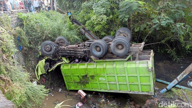 Sebuah dump truck menabrak sejumlah kendaraan diduga menewaskan empat korban. Salah satu korban meninggal, diketahui masih terjepit di dalam kabin truk yang masuk sungai dalam keadaan terbalik.