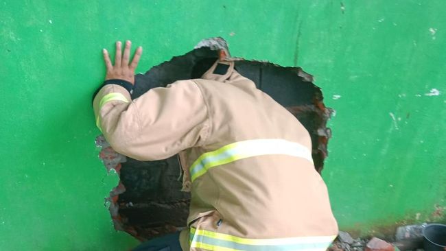 "Kami terima laporan ada orang terjepit di tembok. Karena Khawatir tubuh korban cedera akhirnya kami terpaksa membobol tembok," kata Petugas Damkarla Gresik, Rizal Nugroho.