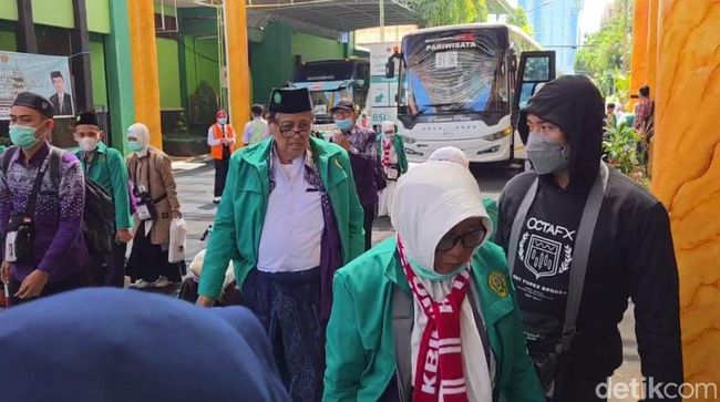 Pantauan detikJatim, sekitar pukul 11.35 WIB bus kloter pertama riba di depan Hall Muzdalifah Asrama Haji. Tampak para jemaah haji turun dan mengambil koper serta tas bawaan dari bagasi bus.