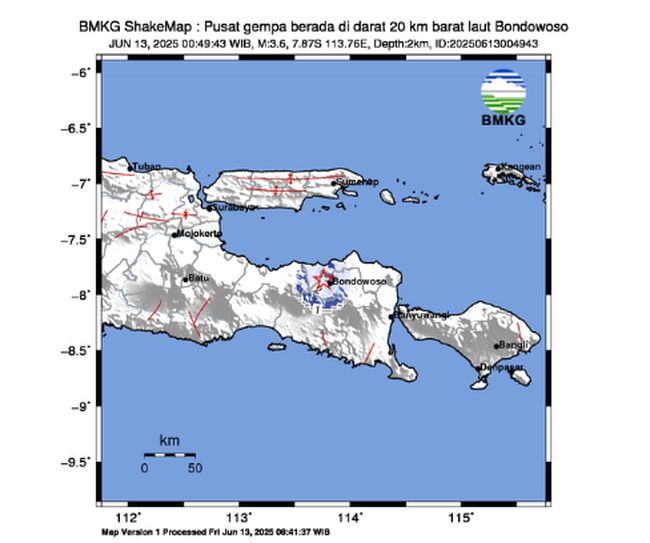 Gempa bumi magnitudo (M) 3,6 mengguncang wilayah barat laut Bondowoso pada Jumat (13/6/2025). Badan Meteorologi Klimatologi dan Geofisika (BMKG) mencatat, gempa terjadi pukul 00.49 WIB.