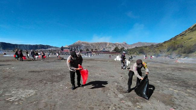 Selain membersihkan sampah sisa upacara dan aktivitas wisatawan, para personel Polres Probolinggo juga memberikan edukasi langsung kepada pengunjung dan warga sekitar agar senantiasa menjaga kebersihan lingkungan.