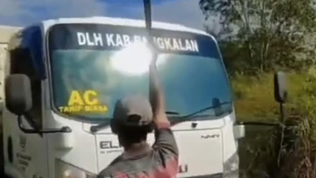 Dalam video berdurasi 59 detik itu terlihat pria tersebut dengan nada marah mengacung-acungkan golok yang dia bawa. Dia meminta pengemudi truk pengangkut sampah itu putar balik.