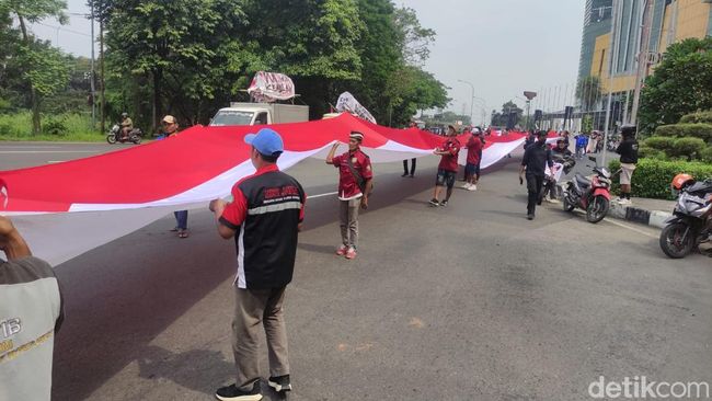 Dalam aksi ini, para sopir membentangkan bendera merah putih sepanjang 1.200 meter dari Bunderan Waru hingga arah Dishub Jatim sebagai simbol perjuangan dan kecintaan terhadap tanah air.