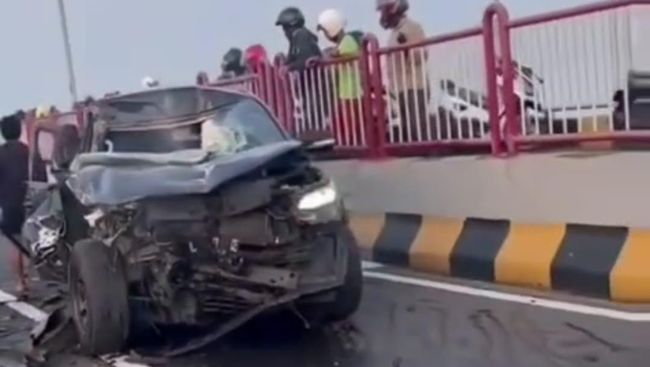 Toyota Fortuner hitam mengalami kecelakaan tunggal di Jembatan Suramadu. Mobil berpelat nomor L 70 CE itu ringsek di tengah Jembatan Suramadu usai menghantam pembatas jalan di ruas Surabaya arah Bangkalan.