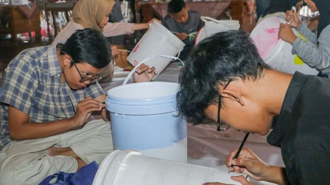 "Kita manfaatkan barang bekas yang ada di sekitar kita biar lebih menarik dan bermanfaat. Biasanya ember bekas cat dipakai untuk tong sampah, tapi kalau kita lukis, bisa jadi lebih artistik dan punya nilai edukasi," jelas Umi.