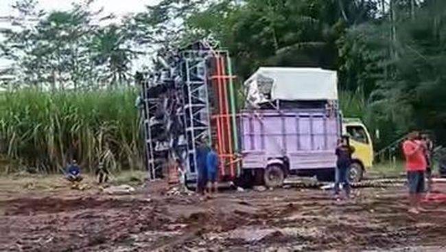 Dari video yang beredar, tampak truk bermuatan sound horeg tak bisa bergerak karena rodanya amblas di lumpur persawahan. Lumpur menjadi basah karena diduga setelah diguyur hujan.