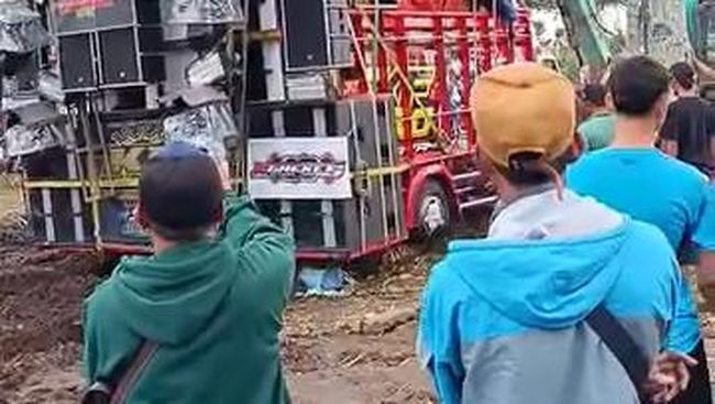 Dari video yang beredar, tampak truk bermuatan sound horeg tak bisa bergerak karena rodanya amblas di lumpur persawahan. Lumpur menjadi basah karena diduga setelah diguyur hujan.