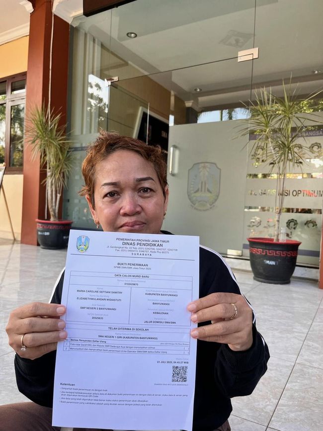 Kisah pilu datang dari Elizabeth Wulandari Widiastuti, ibu tunggal asal Kelurahan Kebalenan, Banyuwangi. Ia datang ke sekolah membawa berkas lengkap dan notifikasi resmi PPDB Jatim yang menyatakan anaknya, Maria Caroline Seftiani Sawitry, diterima di SMAN 1 Giri melalui jalur domisili.
