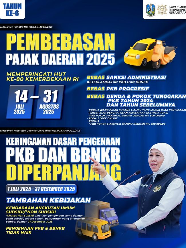 Pemerintah Provinsi Jawa Timur kembali menghadirkan program pemutihan pajak kendaraan bermotor tahun ini. Program yang telah digelar selama enam tahun berturut-turut ini kembali dilaksanakan sebagai bagian dari rangkaian peringatan Hari Ulang Tahun ke-80 Kemerdekaan Republik Indonesia tahun 2025.