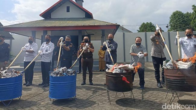 Pemusnahan sejumlah barang bukti itu dilakukan dengan cara dibakar, dan ada yang dihancurkan sebelum dibuang.