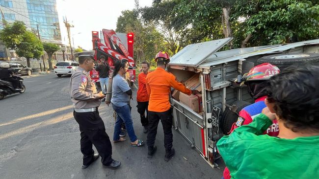 Sebuah pikap boks terguling di Jalan Jemursari, Kecamatan Wonocolo, Surabaya. Saat terguling pikap nopol L 9952 C itu memuat oli dan suku cadang motor.