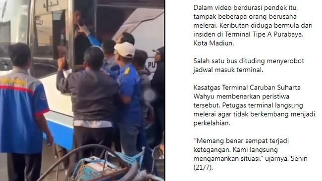 Perkelahian sesama kru dua PO bus terjadi di terminal Caruban, Madiun. Perkelahian yang berujung adu mulut, saling tuding, dan saling tarik antara sesama kru bus itu terekam video dan viral di media sosial.