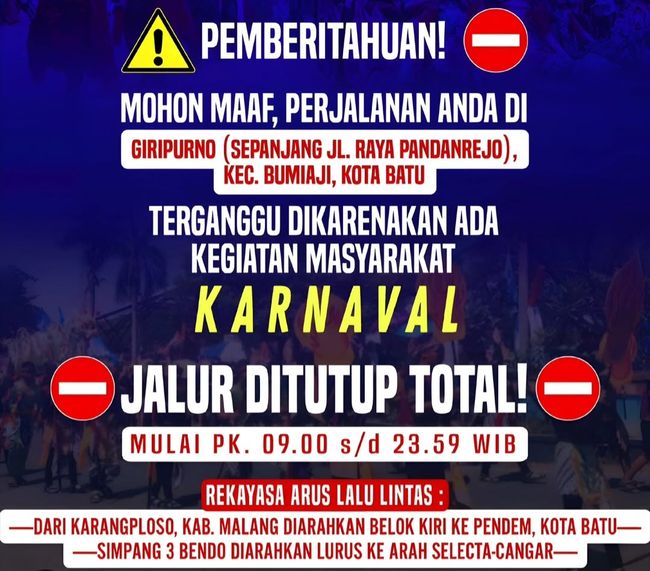 Akses Jalan Raya Pandanrejo, Kecamatan Bumiaji, Kota Batu, tutup total pada Rabu (23/7/2025). Penutupan jalan ini dilakukan karena ada karnaval yang diselenggarakan oleh warga Desa Giripurno dan Desa Donowarih.
